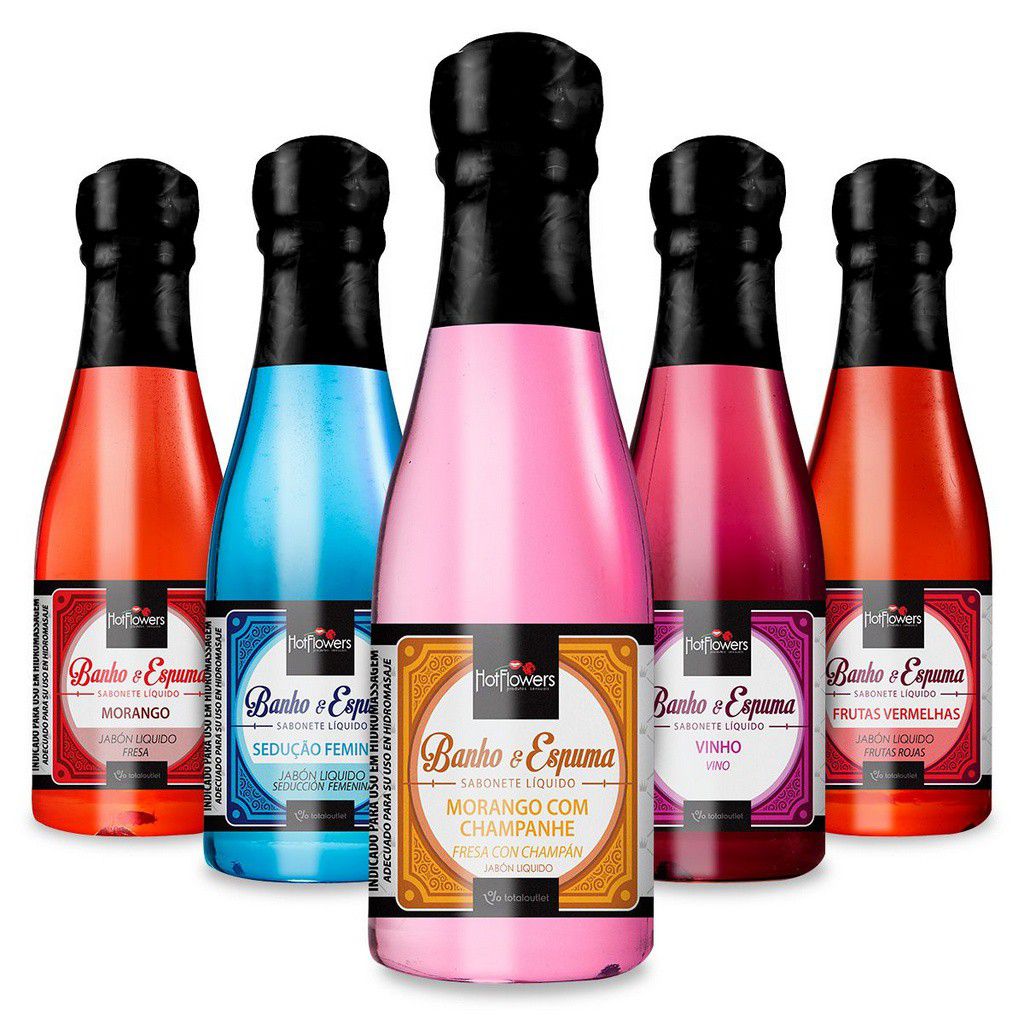 Sabonete Líquido Morango banho & espuma. Os sabonetes líquidos unem dois aspectos deliciosos. Além de sabonete, são também, refrescantes banhos de espuma. A embalagem na forma de champanhe confere um clima ainda mais especial e prazeroso.